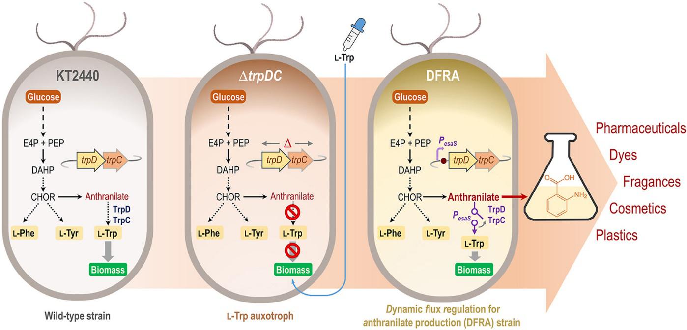Fernández-Cabezón, L., Rosich i Bosch, B., Kozaeva, E., Gurdo, N., and Nikel, P. I. 1. (2022) Dynamic flux regulation for high-titer anthranilate production by plasmid-free, conditionally-auxotrophic strains of Pseudomonas putida. Metabolic Engineering, DOI: https://doi.org/10.1016/j.ymben.2022.05.008